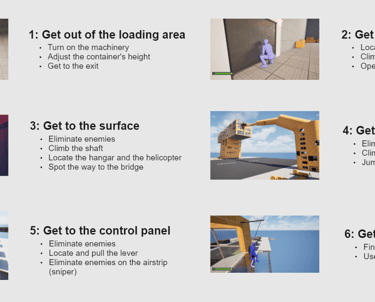 The player finds himself on an hijacked from scrapyard aircraft carrier that went airborne. He has to navigate through loading bays, warehouses, corridors and towers to get off the carrier using a helicopter. The whole ship is falling apart as it was meant to be scrapped. Throughout the journey from the bottom to the very top of the level the player will encounter mercenaries responsible for the hijacking. The goal is to locate the helicopter, disable locking mechanism and get to the hangars.